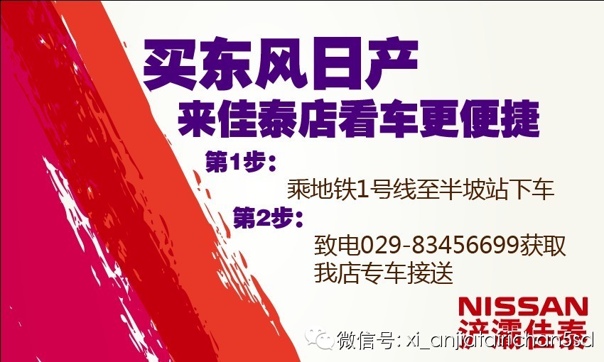 更多精彩内容敬请扫描我店二维码或搜索“东风日产浐灞佳泰专营店”添加我店公众微信,更多优惠,更多惊喜等着您!
