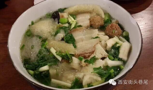 骨、鸡鸭肉调好的白汁汤。食者将馍掰好后,经厨师用高汤、蒜苗、粉丝把馍煮好,碗中三鲜颜色鲜亮,高汤色白,香气四溢,所谓丸子黄、肉片红、面皮奶色,再加上一点辣子,更是五颜六色,分外好看,也颇能引人食欲