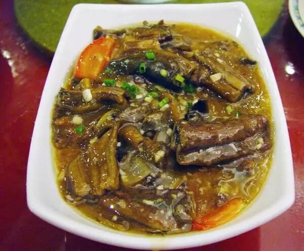 岳口的鳝鱼片,也很有特色。和其他的泡蒸鳝鱼做法都不一样,它是用一条条黄鳝切成两段加上佐料烹烩而成,出笼时再盖以韭黄或木耳,淋上滚烫烫的熟油,食用时色味俱佳,滚烫鲜嫩,使人胃口大开。