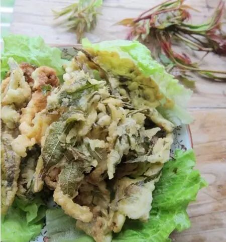 待我们把采摘的一篮子椿芽儿拎回家,妈妈就开始在灶前忙活起来。用筷子把椿芽嫩叶放进搅拌好的稀面糊糊里打个滚儿,然后放入油锅里煎炸,我们趴在锅沿儿边眼巴巴地看着,看那白色的面鱼儿在油锅里冒泡儿,渐渐地变硬变黄,心里乐开了花。待椿芽儿鱼煎炸好,姐弟俩在母亲的微笑里大快朵颐。