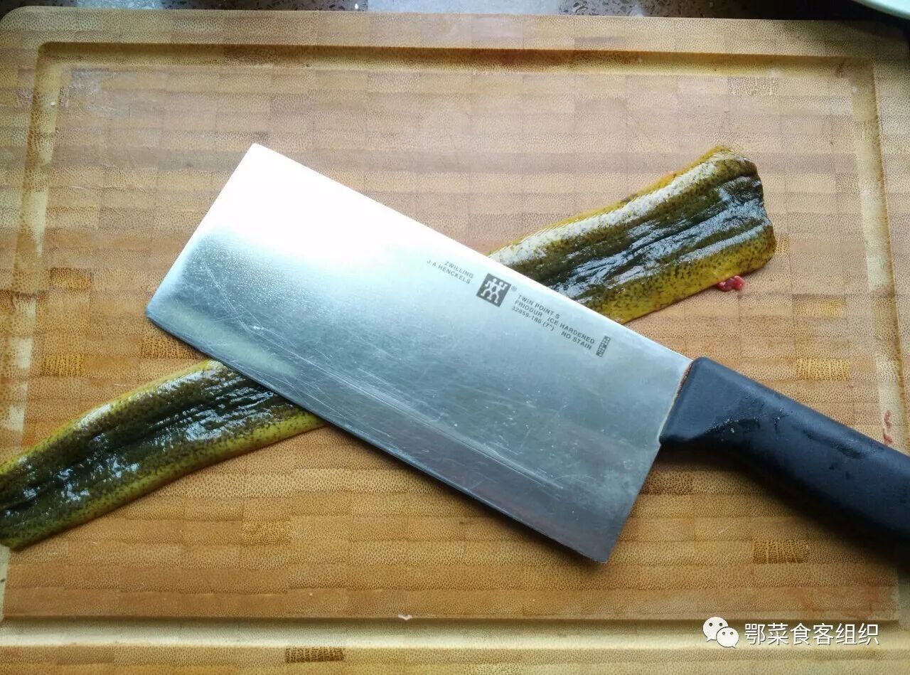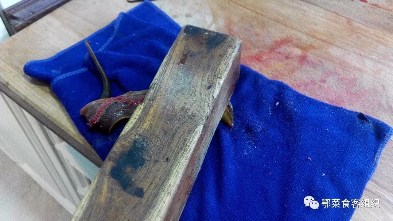1、精选2两鳝鱼4-5条,首先破肚、锤平、退刺,这是最关的事前动作。用22年历史的棒槌,锤平食材,使肉紧有嚼劲,同时方便退掉鳝鱼上面的鱼刺;
