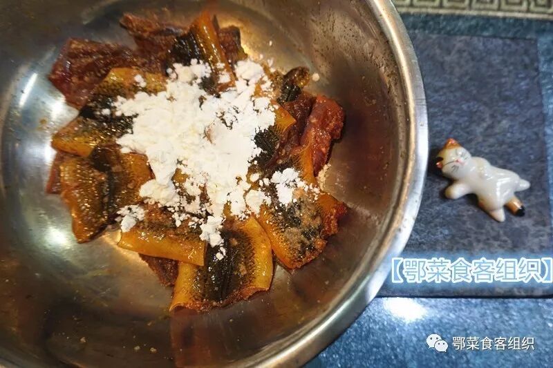 4、再放入6g米粉(非粉蒸鳝鱼,米粉略少)均匀撒上,并搅拌均匀至米粉融化;