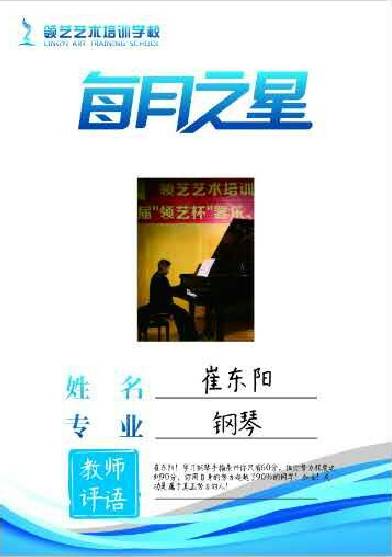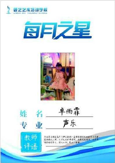 卓雨霏:在学习声乐期间,一直都保持着积极的学习态度,坚持按时上课,从不无故旷课请假,有很大的进步,老师希望你继续努力,坚持以恒,更上一层楼!