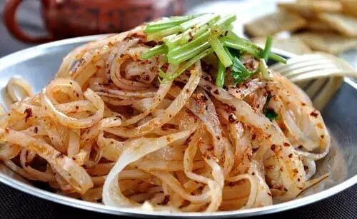 凉皮是西安当地的名吃,凉皮的做法也多样,其中尤以秦镇凉皮作为有名,至今已有2000余年历史,调好的凉皮全呈红色,辣里透香,味道爽口,顺滑Q弹,备受食客喜爱,西安市内也有多家人气极旺的凉皮店。在西安深受欢迎。