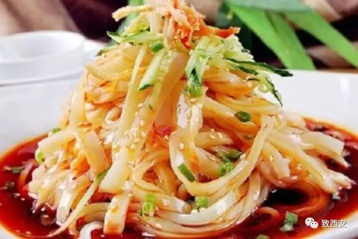 因为擀面皮是从唐代冷淘面演变而来,其面皮选料精良,工艺严谨,调味讲究,以“白、薄、光、软、筋、香”而闻名,凉爽可口,具有筋斗、柔软、凉香、酸辣可口、四季皆宜之特点。在古代,擀面皮乃是给宫里的御供食品,故西府人又称擀面皮为“御京粉”。![]()