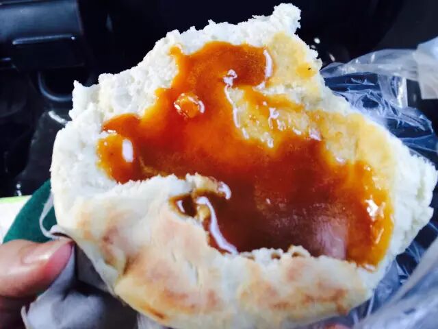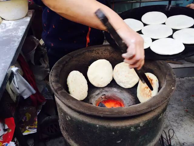 刚出炉的红糖锅盔,透着面粉香,吃的时候一定要注意,小心烫嘴!小编教大家一个吃红糖锅盔的小技巧,横着拿,掰着吃,每一块面饼都能蘸着浓香的红糖馅,太美啦!
