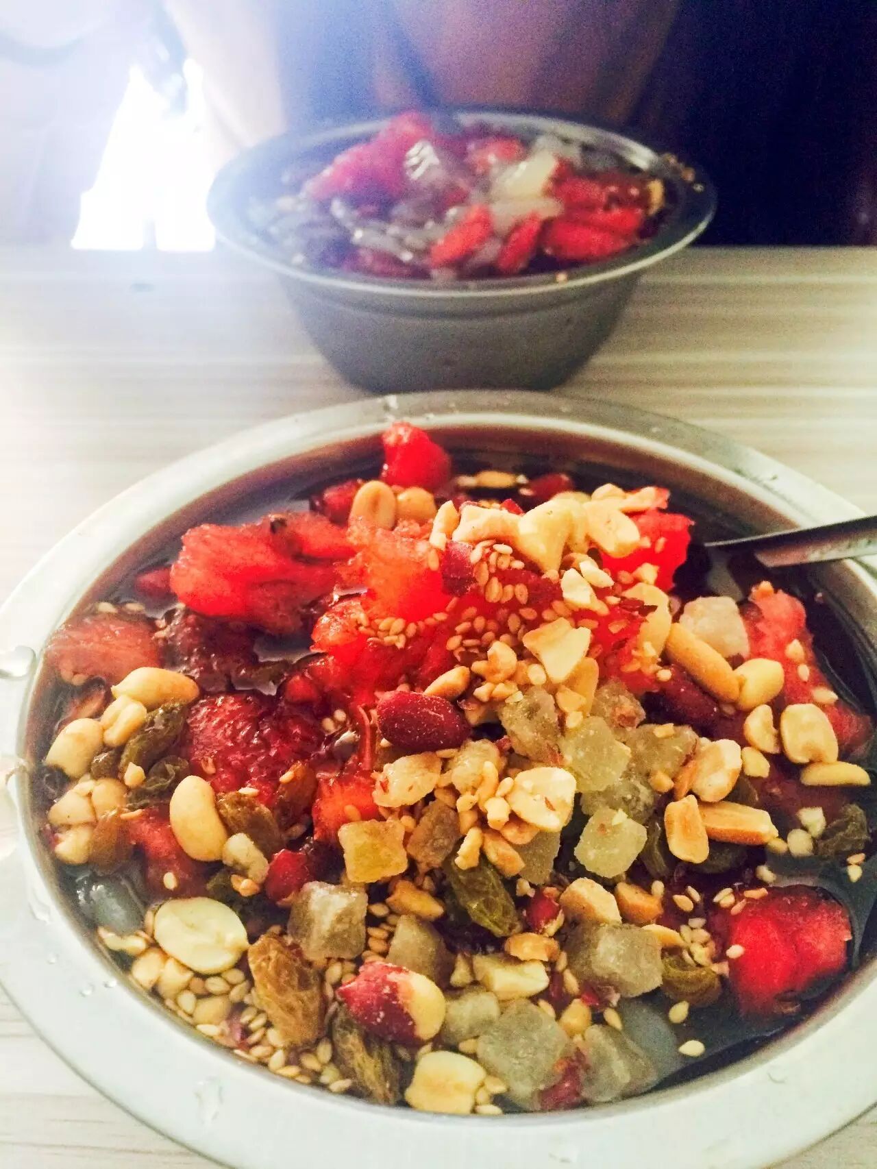 店里一份冰粉就花样十足,里面加了冬瓜糖、葡萄干、山楂片、芝麻、花生等,还可以升级加西瓜。