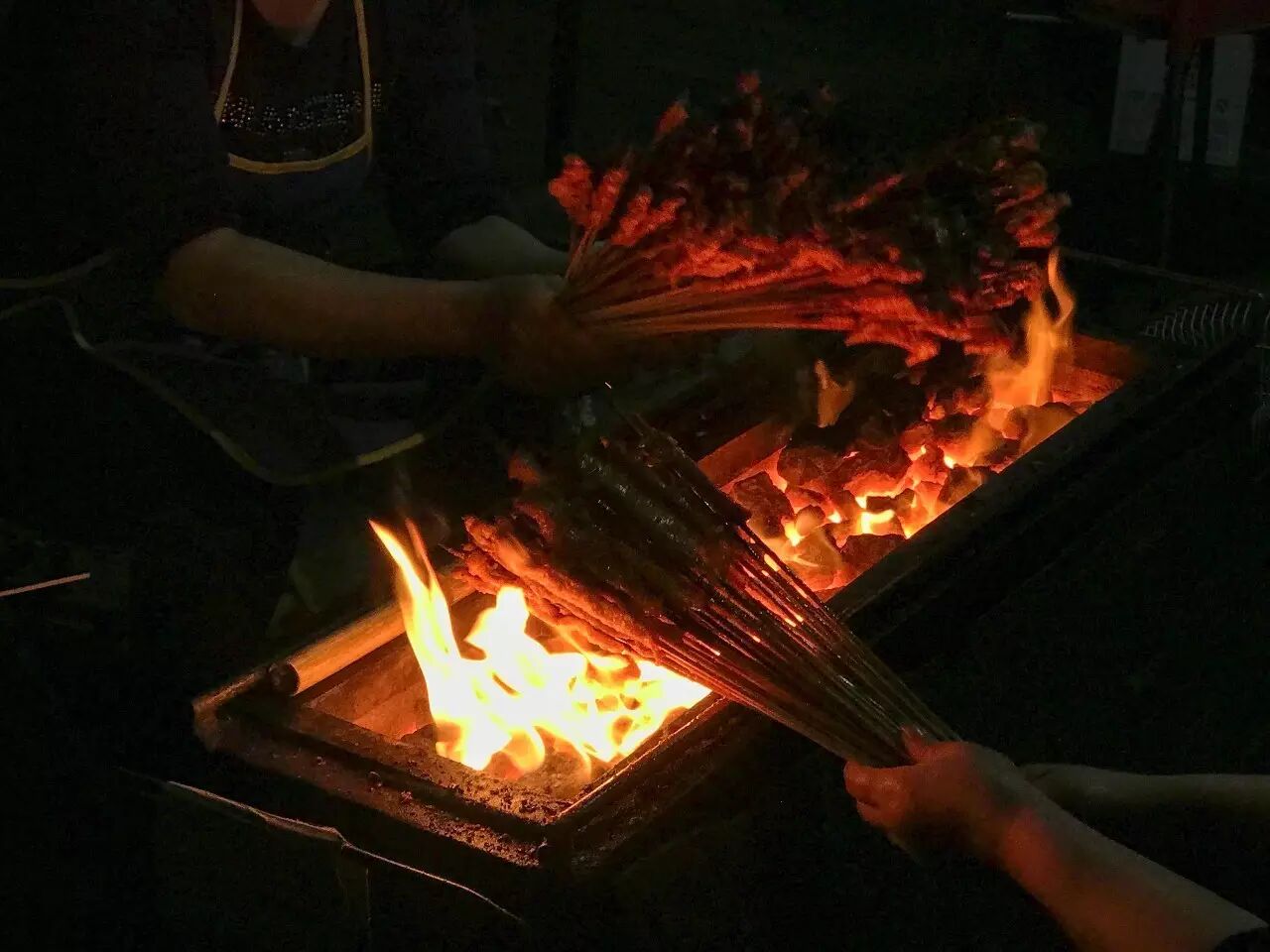 乐至的烤肉是生烤,先把肉烤到半熟再淋油码料,讲究的一大把肉串,在炭火上翻转、上料、淋油、摊开、合拢……一连串动作下来,冒着鲜亮油光的肉串让人食指大动!