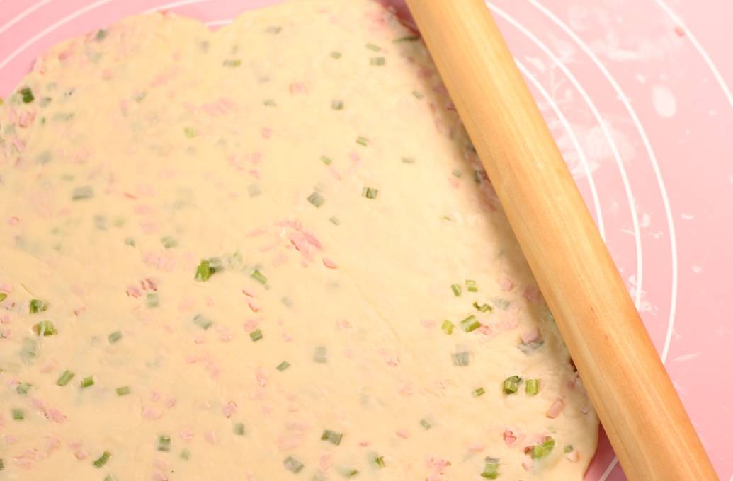 8、将葱花和火腿丁均匀地撒在饼皮上。
