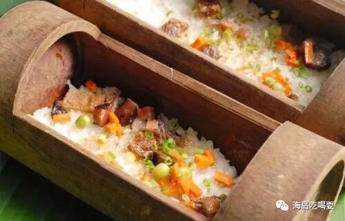 海南黎族传统美食。是用新鲜竹筒装着大米及味料烤熟的饭食。黎族民同,多于山区野外制作或在家里用木炭烤制。现经烹调师在传统基础上改进提高,使之摆上宴席餐桌,声誉甚高,成为海南著名风味美食。