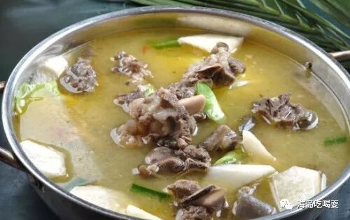 猪脚牛腩饭是海南最负盛名特色小吃之一,而且是地道的百姓饭。通常煮牛腩猪脚的肉锅是放在店铺最前面位置的,两口大锅一个煮着牛腩,一个烧着猪脚。牛腩和猪脚经过慢火长时间蒸煮,再加上独特配料,肉质柔软不腻,非常好吃。对食客的建议是,最好是牛腩和猪脚各来一份,一起混着吃,那味道就别提,太可口了。海南的猪脚牛腩饭并不是指只卖牛腩和猪脚的店。这种饭主要以猪脚、牛腩为主,同时还经营着猪杂、牛杂、五花肉、芋头根子、酸竹笋、炒空心菜、西瓜皮、酸菜等各种家常菜。