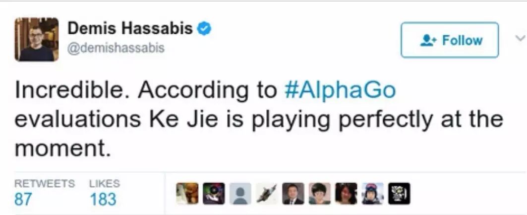 其实,在双方第二局对阵时,尽管柯洁惜败,但哈萨比斯却对柯洁大加赞赏,并发推文大呼不可思议,根据AlphaGo的评估,柯洁在比赛过程中接近完美。