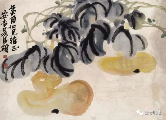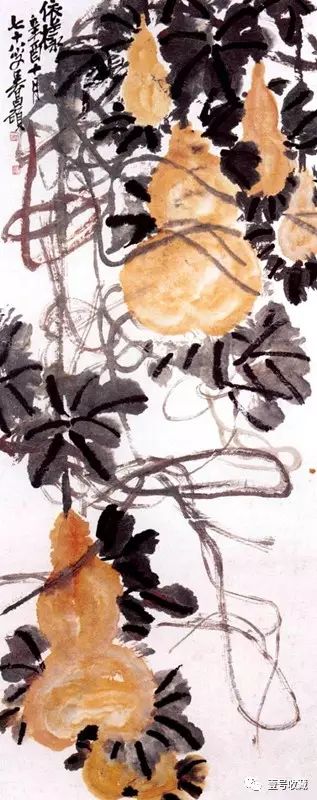 吴昌硕喜欢以泼墨写叶,浓墨勾叶筋,淡墨写葫芦,使得整幅画显得生意盎然。