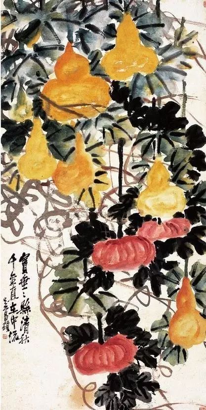 上面这幅葫芦,构图呈半弧形,花叶藤蔓依势而下,上密下疏,几欲撑满全纸,五只葫芦各择其位,画幅下端那只垂枝往下,勃勃生机也。藤蔓于此处弯环向上,为全图形成俯仰顾盼态势,既合物理,又合画理。不经意间已为题款留出位置,十四个字分列三行,笔墨浓淡、字体大小、经营位置,恰倒好处。吴昌硕作此画时年已七八,满腹画稿,信手挥写即可,可谓妙哉!