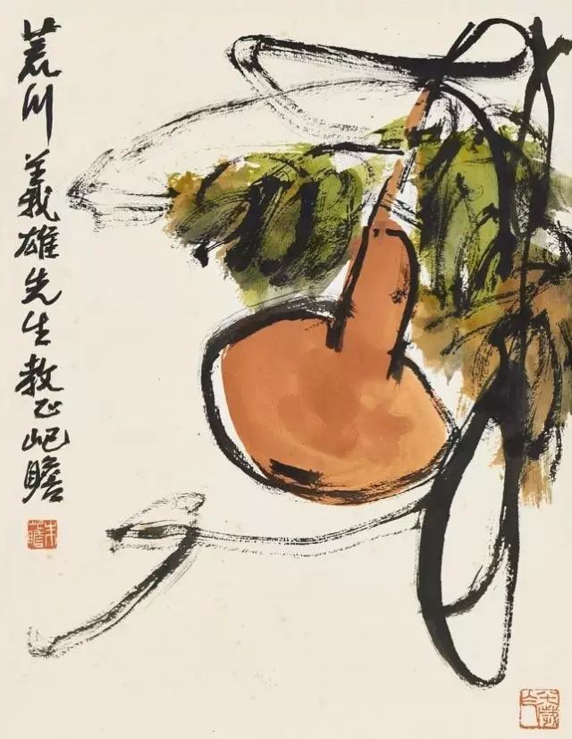 在上面这幅《葫芦图》中,主体物在画面的上端和中部抱团集中,末了,象徵性的扫了两笔藤须,避免了集中而带来的凝滞感受,为灵动之气制造了一个出口;整体呈倒三角之势中心线与对角线重合,自上而下喷薄而出,边幅不修却处处透露了璞玉浑金的艺术才情。画中的五言诗款识,更使《葫芦图》诗中有画,画中有诗,意境深远。