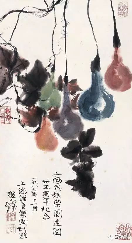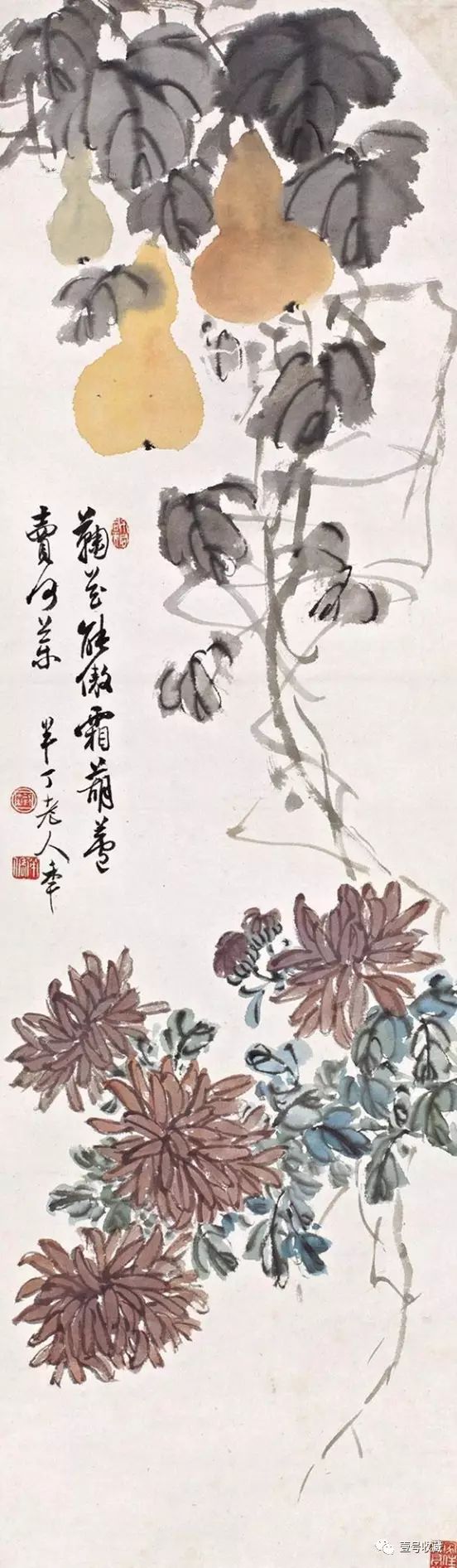 吴昌硕葫芦画设色古朴,用笔豪放,充分表现了吴昌硕古拙、浑重、豪迈的画风。吴昌硕的葫芦画不仅精彩在葫芦上,有时题款更能起到画龙点睛的作用。