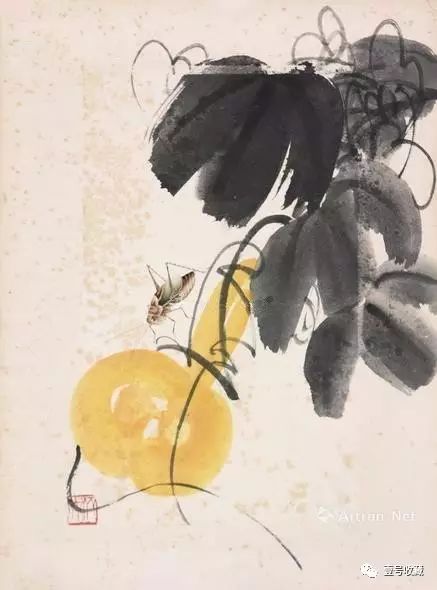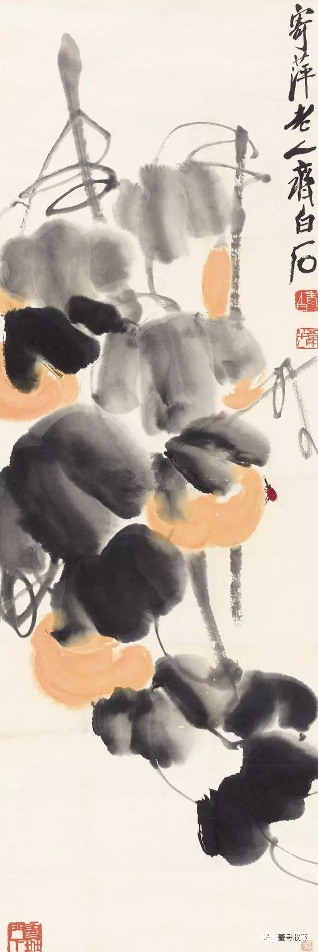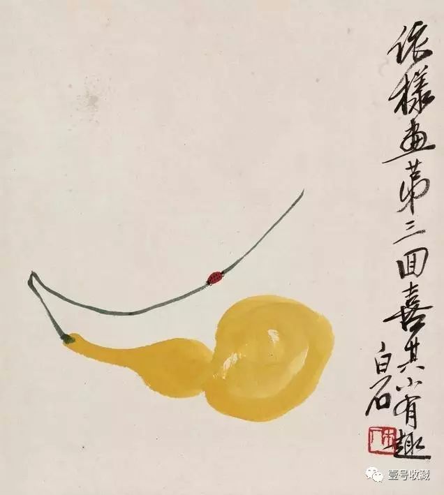 齐白石画葫芦以黄葫芦、墨叶的组合方式为多,上面这幅《葫芦图》正体现出他典型的艺术特色。浓艳的柠檬黄和厚重的墨叶形成强烈反差,画面气氛十分热烈。