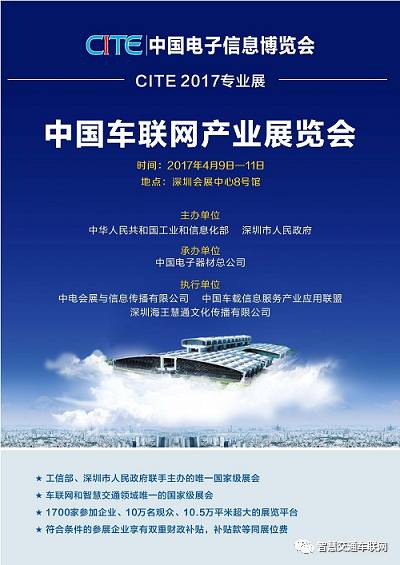 中国车联网产业博览会是中国电子信息博览会的一个专业展,是国家工信部、深圳市人民政府联手主办的也是唯一的国家级车联网与智能汽车的展示平台,与中国电子展、中国锂电新能源展、充电桩展等其他专业展共同组成了CITE 2017。