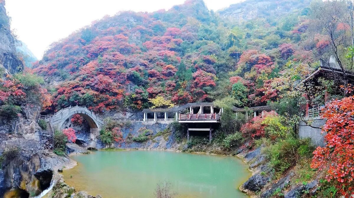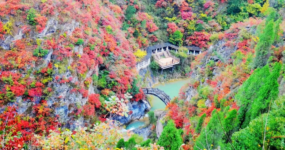 青山对峙,涧流清澈,一汪汪潭水似明珠相串,一挂挂短小的瀑布迭次相连,更有亭、桥、廊、榭,相映成趣,美丽盎然。