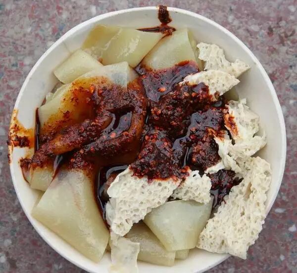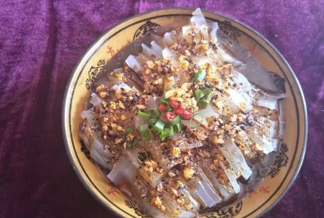 由荞麦、大豆制成,红军凉粉光滑、晶莹、柔软,食时拌上各种调料,可解暑除烦闷。