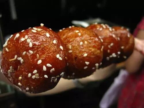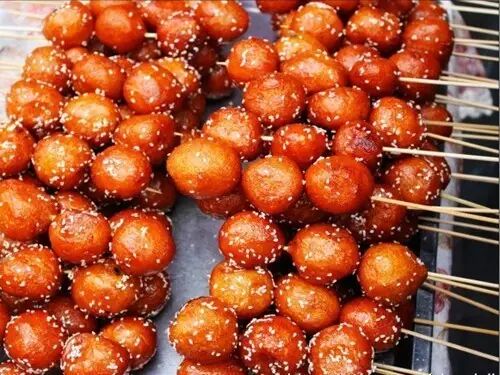 浑圆光亮的糖油果子,糯米粉红糖做原料,放入油中炸到金黄酥脆,表面洒满喷香的白芝麻。一口咬下皮脆内软。