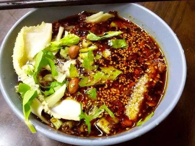 肺片和牛肉浸在油亮的红油里。新鲜的肺片香脆嫩滑,入口不老不绵,韧性十足,红油香而不辣,配料丰富。花生和芹菜的香味入口给味蕾极大的冲击,让人欲罢不能。