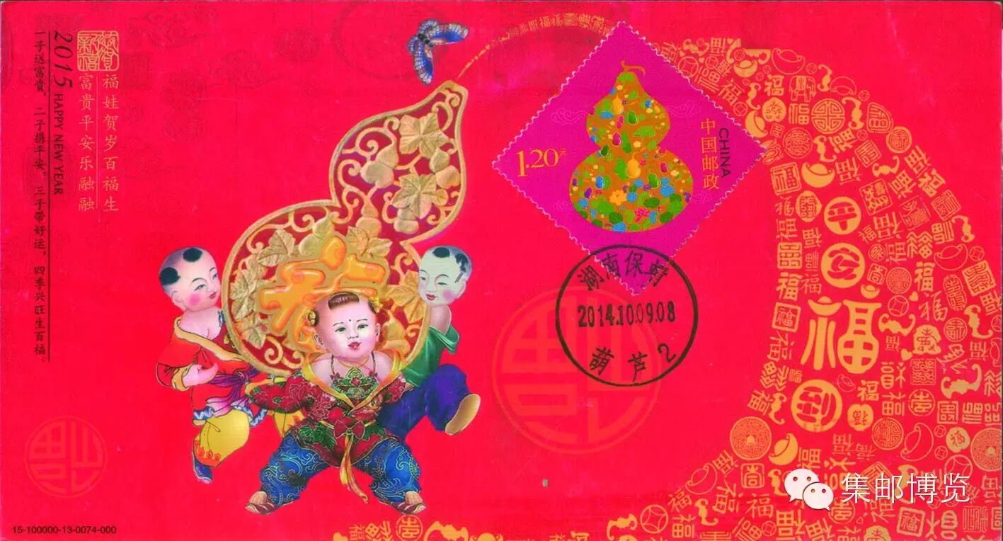 接下来,三个胖嘟嘟的童子抬着大葫芦出场了,他们合力将满满的祝福从葫芦里倾倒出来,真是“福娃贺岁百福生,富贵平安乐融融”啊【2015年国版贺年有奖明信片“平安送福”】。