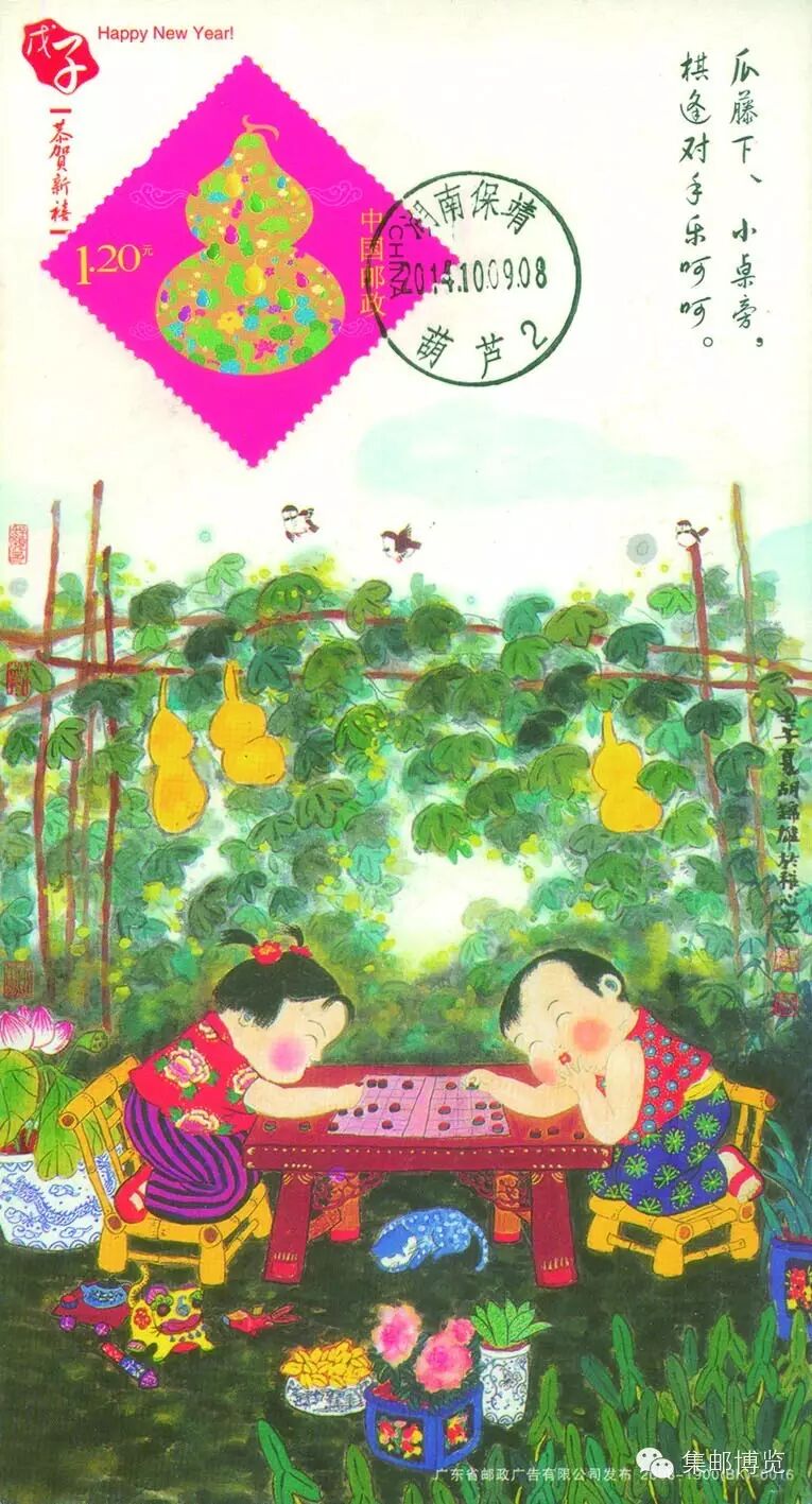 炎炎夏日,一架葫芦遮阳避日,绿荫架下两童子分坐桌前,对弈一局,“瓜藤下,小桌旁,棋逢对手乐呵呵”,其乐融融【2008年广东邮政贺年有奖明信片,贴2014《幸福美满》贺年专用邮票,销“湖南保靖 葫芦2”日戳】。