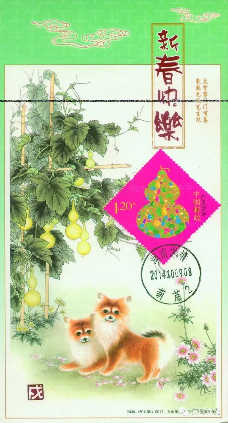 你看,绿油油的葫芦架上,挂着一只只黄橙橙的葫芦,两只可爱的小狗端坐架下,营造出一派祥和的氛围,配上贺年语,在新春来临之际,收到这份祝福的人也一定会满心欢喜吧【2006年山东贺年有奖明信片,贴2014《幸福美满》贺年专用邮票,销“湖南保靖 葫芦2”日戳】。