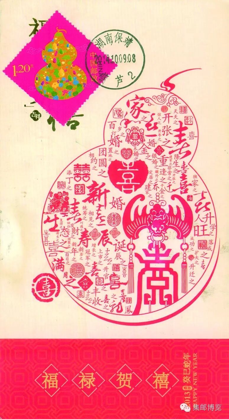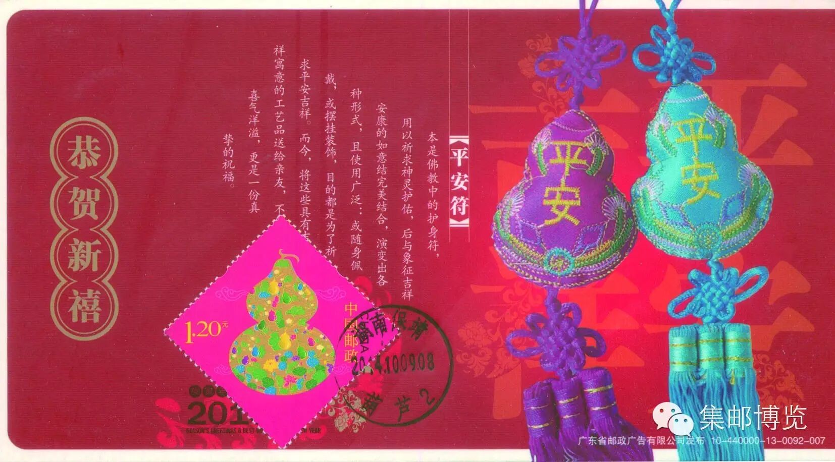 吉祥、喜人的亚腰葫芦,通过聪明的手工艺人之手,打上漂亮的中国结,制作成吉祥的平安符,将这样的具有美好寓意的工艺品送给亲朋好友,不仅喜气洋溢,更是一份非常应景的真挚祝福【2010年广东邮政贺年有奖明信片,贴2014《幸福美满》贺年专用邮票,销“湖南保靖 葫芦2”日戳】。片、票、戳三者构成了一个和谐统一的吉祥喜庆的画面。