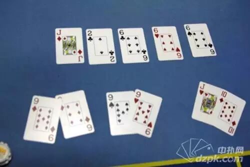 摊牌:LAG亮出J♥10♦,做成顶葫芦;大盲位玩家亮出9♠9♥——低葫芦;而我们的主人公则亮出四条6,成功收下这一大锅。