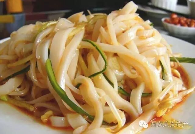 传统手工做的,比较厚,切出来的条横截面是正方形,突出酸辣麻香和芥末蒜汁的复合味道。