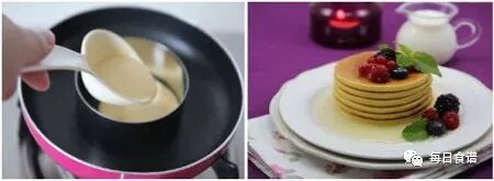 6、小贴士:1.为了达到每张饼都一样大小,我用了一个直径10CM的慕斯圈,等一面煎好后,用小刀沿着内壁划一圈,煎饼脱落,再煎翻面;2.这里将蛋液隔热水打发是为了:面糊更加膨松,吃起来更有弹性;3.枫糖浆如果没有可以考虑用蜂蜜、黄糖浆等都可;4.水果也可以根据个人喜好调整。