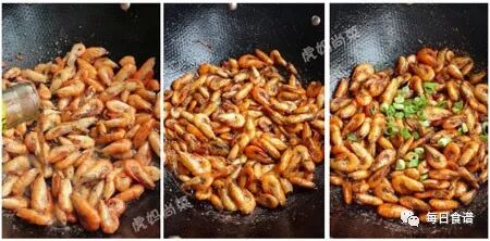 3、待河虾皮渐为油亮透明时,加入适量的料酒、盐,继续翻炒至料酒蒸发完;放海鲜酱油少许,着色即可,继续翻炒至虾是干干的样子;最后放绿葱叶翻炒均匀即可。