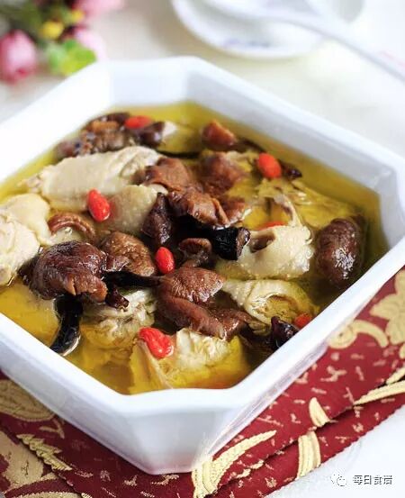 5、小鸡炖榛蘑是东北的名菜,做法是小鸡先焯水在翻炒,加八角、花椒粒等的香料和榛蘑一起炖的,其实这种做法有点像红烧。“炖”字我还是喜欢“清炖”保持原汁原味。我的这种做法不是东北菜,就是自己很喜欢的一种菌类和土鸡的清炖法,所以东北的美食爱好者们,不必说我做的不正宗,这不是东北菜。