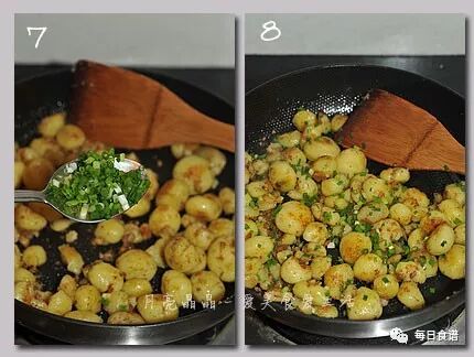 5、倒入葱花。翻炒至调味均匀裹在小土豆表面即可。