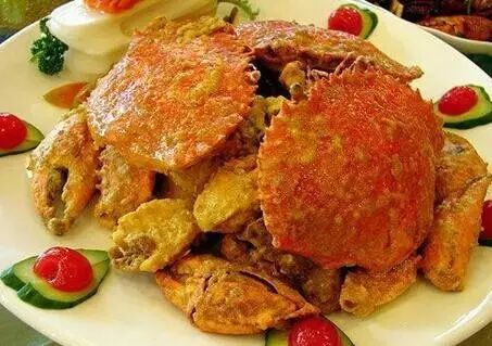 炸海蟹呈红赤色,味咸香辣,肉质鲜嫩,是乳山的特色菜肴之一。