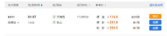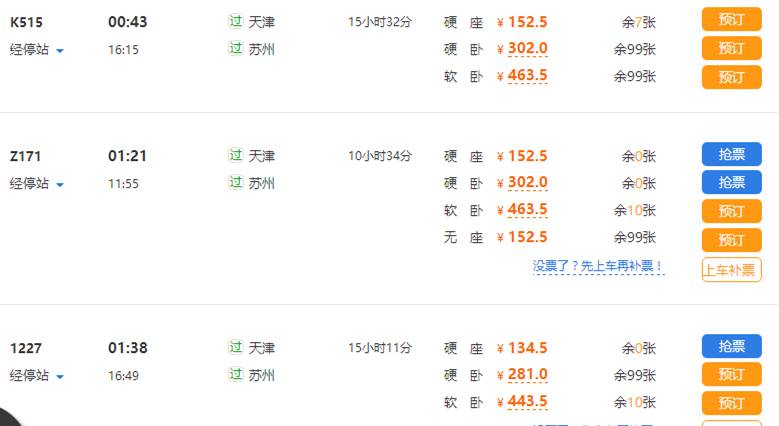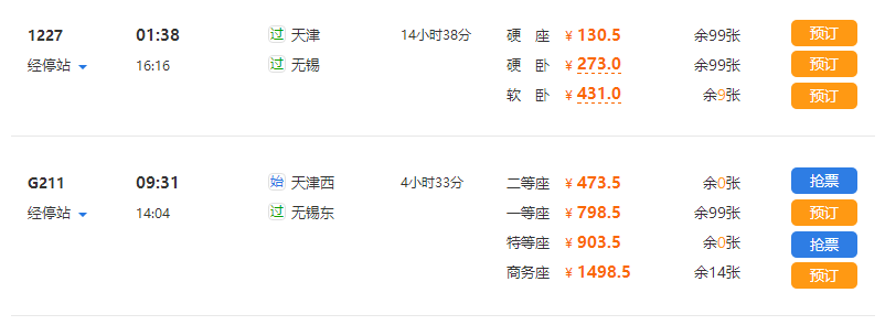 天津的到无锡有18个车次,时间从4小时到14小时都有,可以根据自己的喜好选择,不推荐四小时,还没睡着呢就到了,不如坐飞机……
