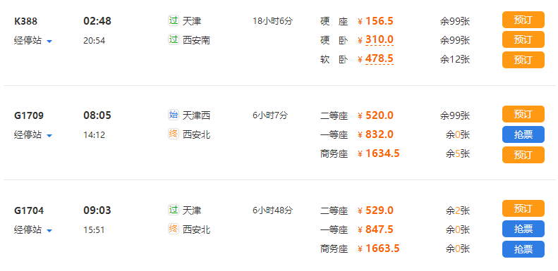 天津的到西安共12个车次,时间从6小时到18小时都有,选择的余地很多