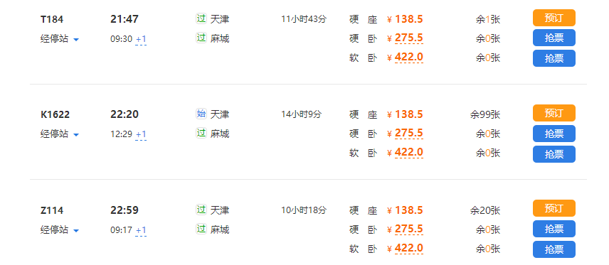 天津到麻城共有9个车次,推荐坐晚上九十点钟的,时间长短正好,价格也便宜