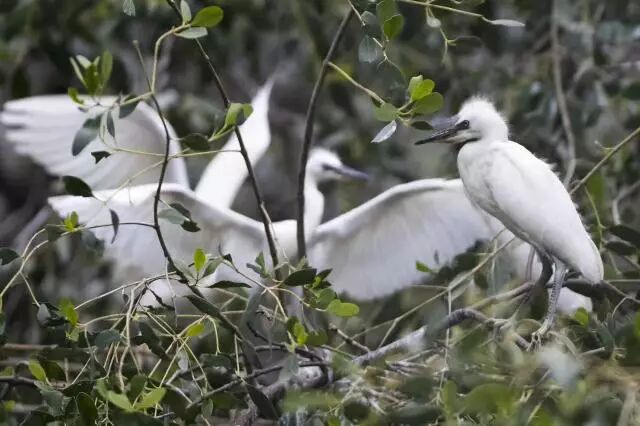 五月初的红树林,树杈上筑满了鸟巢,筑巢哺育,嘤嘤鸣声。许多出生1个多月的可爱小白鹭正在学飞,有的呆在枝头犹豫起飞,有的在空中翱翔,耳边一片鸟儿欢乐的歌声。不少红树林陆续开花结果,落地的果实将生长成新红树。