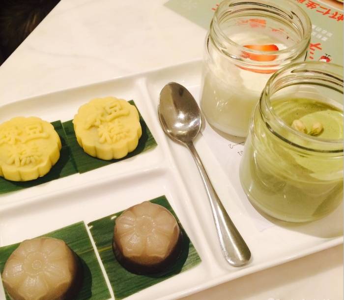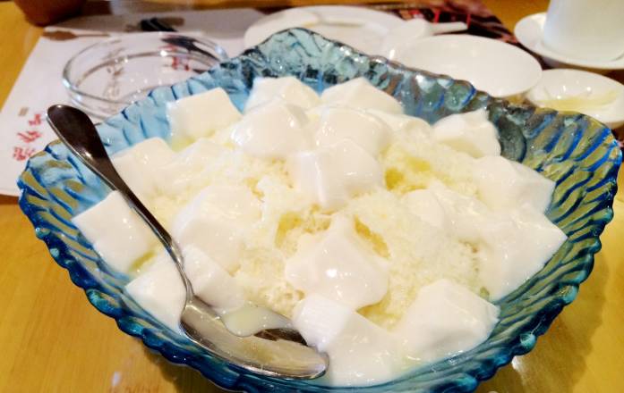 玉脂冰清里的杏仁豆腐口感比较韧,