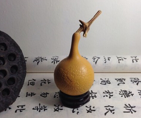 6、范制葫芦:范制葫芦者,当其幼小时纳入有阴文花纹之范,秋老取出,形状图文悉如人意,宛若斧削刀刻而成,诚天然与人工之巧妙结合。范制葫芦的最终形态令人称奇,它也是我国所独有艺术品。这种工艺由当初创作者大胆设想发明,并经长期探索、多方实践终于形成。