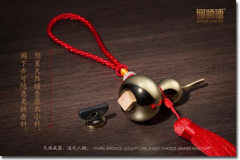 比如,很多买铜葫芦的人都把它挂在车后视镜上作为饰品,我就在小葫芦里面放上一块檀香木,让清香透过透气孔散发出来,净化空气,让铜葫芦不仅能看,还能切实的发挥作用。
