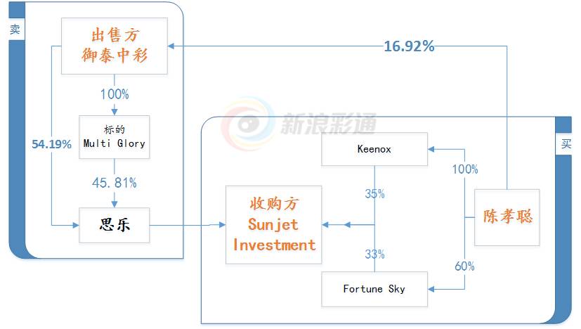 陈孝聪是御泰中彩的大股东,占16.92%股份。交易前,御泰中彩持有思乐100%股份,换言之,陈孝聪间接占有思乐16.92%股份;交易后,陈孝聪通过控股公司间接持有思乐53.37%股份。