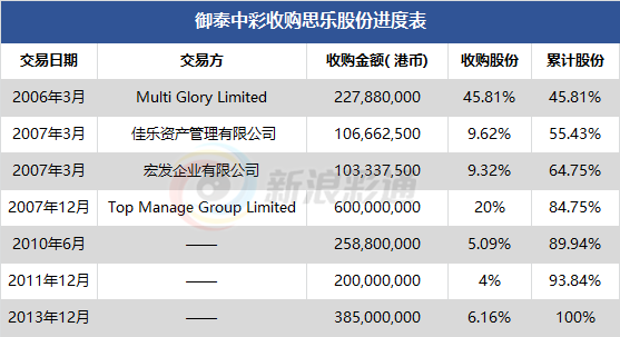 可以看出,即使近年受中国彩票增长放缓影响,思乐的业绩有所回落,但它仍然是一份优质的彩票资产。正是基于此,御泰中彩早在2006年3月以2.28亿港币收购Multi Glory当时所持有的深圳思乐45.81%的股权。