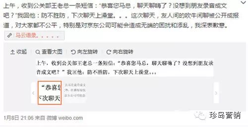 马云收到公关部王老总一条短信:“恭喜您马总,聊天聊嗨了?没想到朋友录音成文吧?”我回他:防不胜防,下次聊天上澡堂。。。