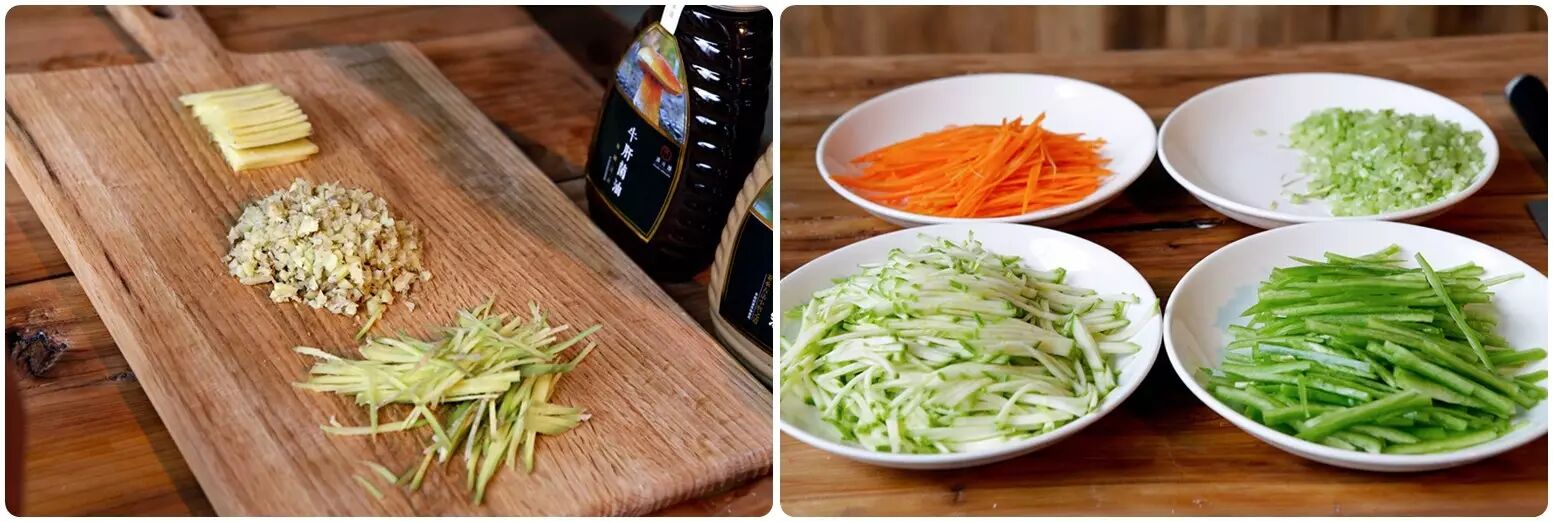 ② 将生姜,西葫芦,胡萝卜切丝,芹菜切丁。