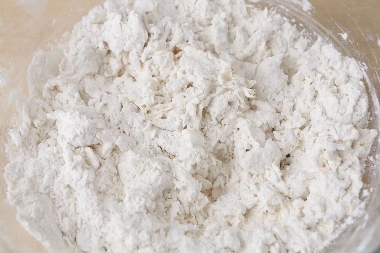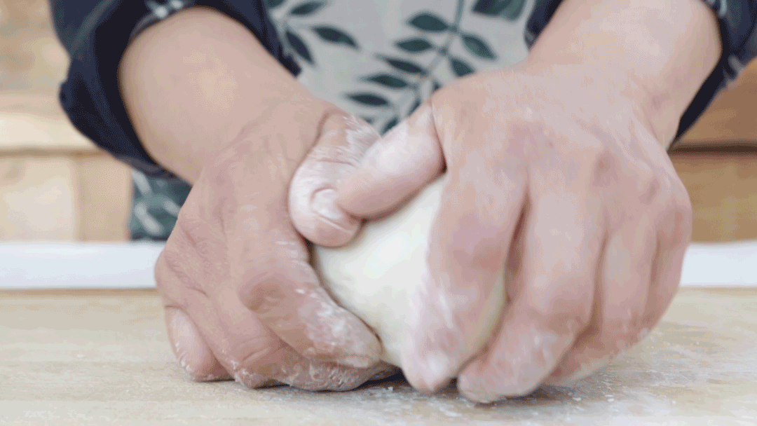 ③ 糯米粉呈现棉絮感时开始揉成面团。