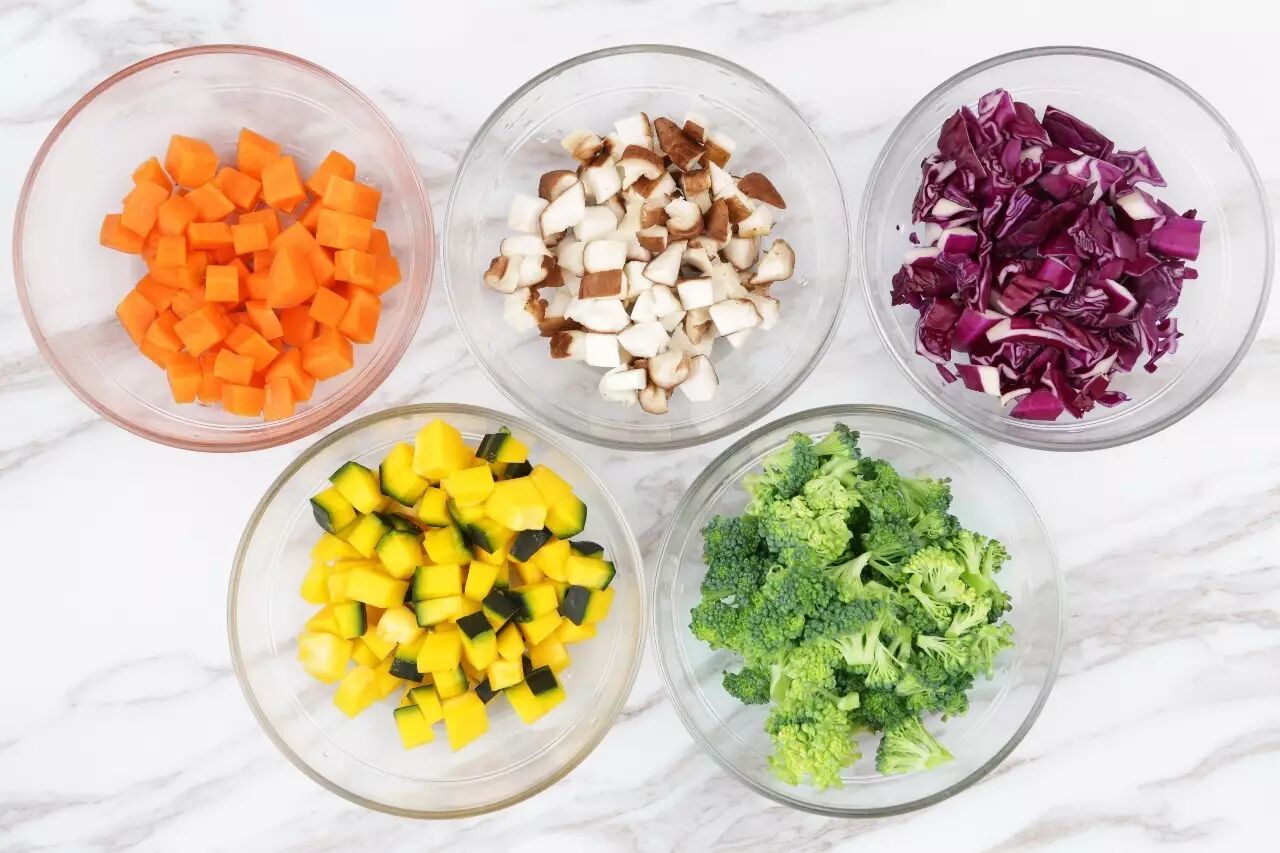 ⑤ 发酵的时候,正好准备蔬菜。胡萝卜切成1cm左右的方块,西蓝花切成小朵,紫甘蓝也是。小南瓜洗净,用刀或者勺子挖掉籽,切同样大小。香菇也是切同样大小。